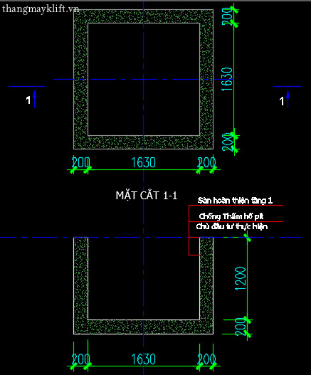 Hố pit thang máy tiêu chuẩn sâu là 1000mm. Nhưng đối với các công trình thang máy có độ sâu bị hạn chế do một số các tác động từ bên ngoài thì người ta sẽ xây chiều sâu hố pit thang máy 600mm. Dưới đáy hố pít có cấu tạo một lớp bê tông dày 200mm. Đảm bảo yêu cầu tối thiểu của hố pít đó là chống thấm. Quá trình thực hiện chống thấm thang máy được thực hiện ngay khi bắt đầu thi công công trình. Mục đích không phải đục đẽo và tránh hiện tượng thấm nước gây ảnh thưởng đến kết cấu cũng như chất lượng kết cấu công trình.