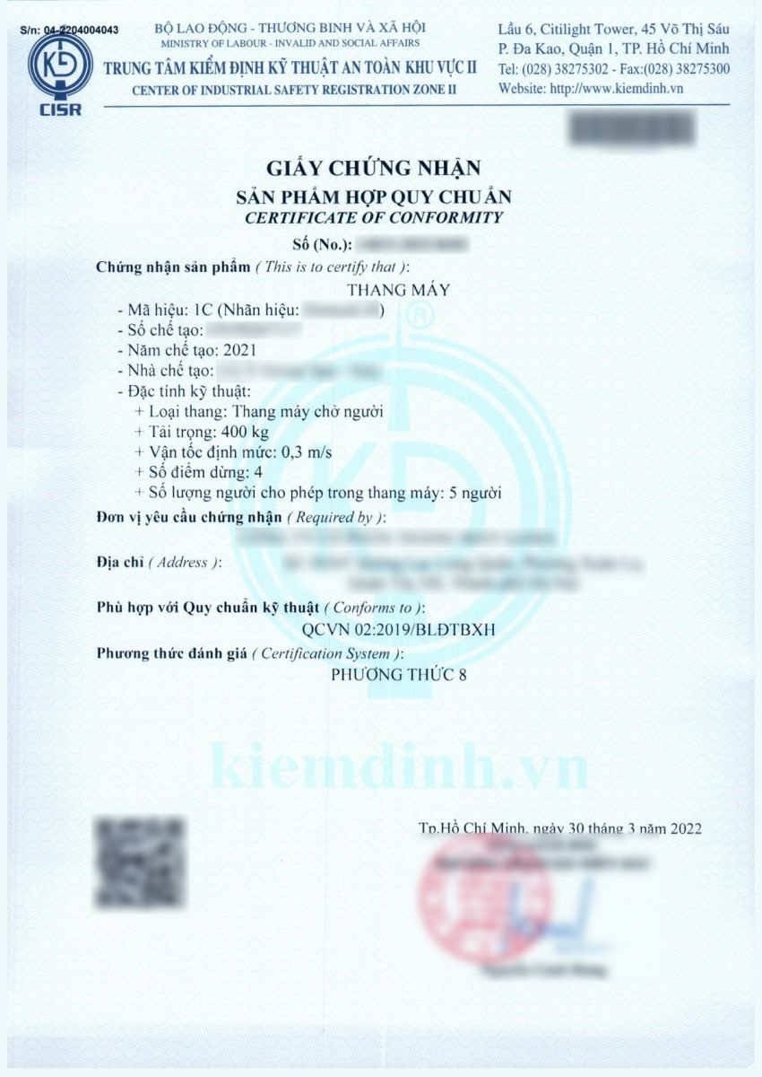 Trong đó, ở điều kiện 2, thang máy được đánh giá phù hợp quy chuẩn sẽ được xác nhận thông qua giấy chứng nhận hợp quy như hình dưới đây: