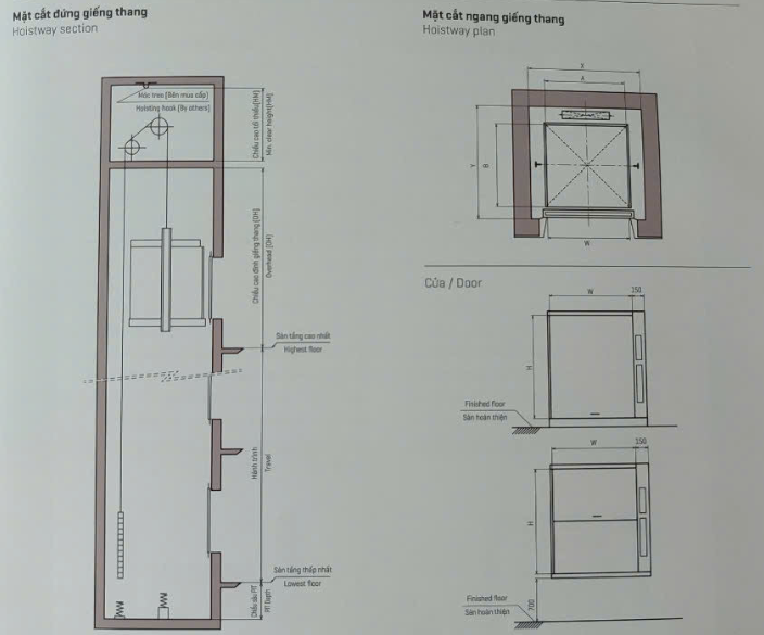 Lưu ý: Các thang máy tải trọng và kích thước phi tiêu chuẩn xin vui lòng tham khảo ý kiến của Thang máy K-Lift để biết thông số chính xác.